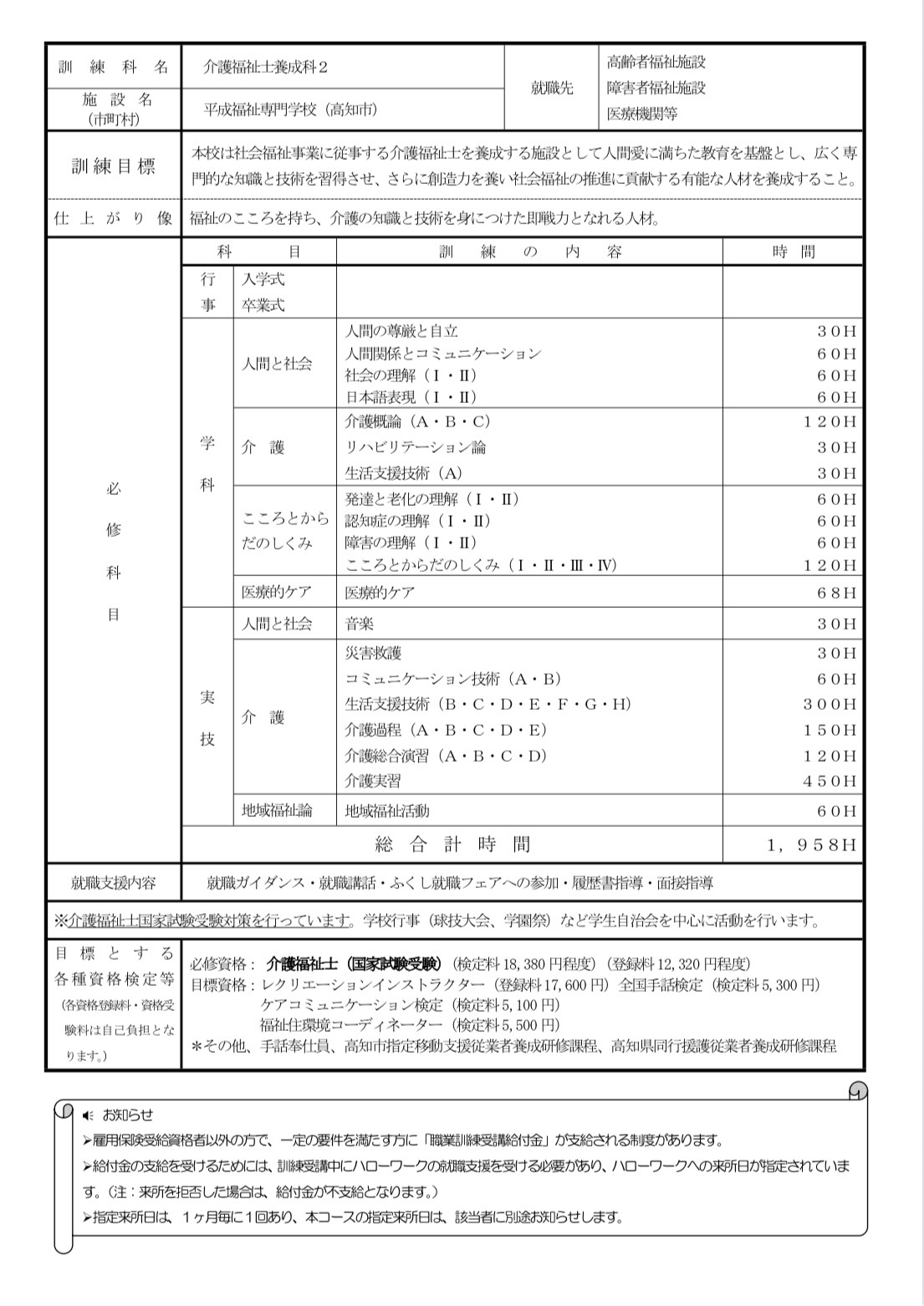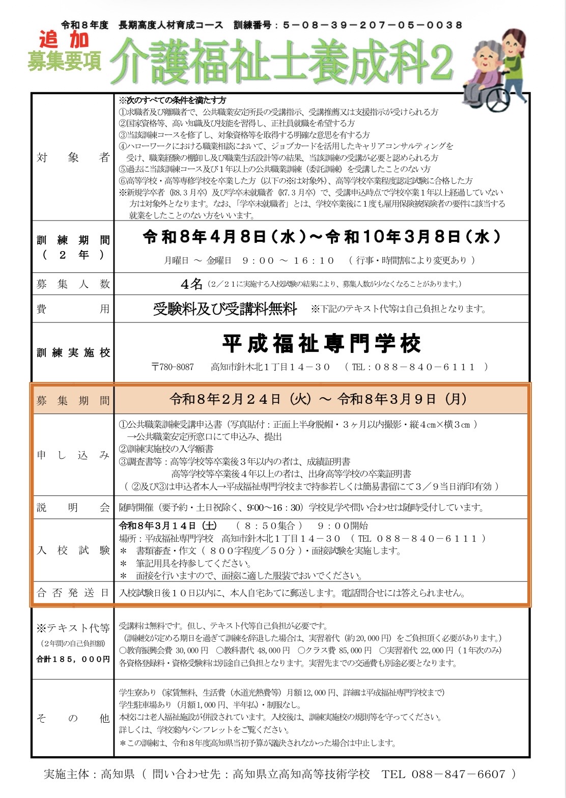 長期高度人材育成コース 追加募集のお知らせ 投稿者: kochi_heisei投稿日: 2026年2月26日 令和8年4月入学の『長期高度人材育成コース』の追加募集のお知らせです! 学習に専念できる環境で、一緒に国家資格【介護福祉士】を目指しませんか。 お問い合わせ・学校見学など、お気軽にご連絡ください! Screenshot Screenshot